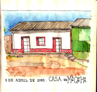 El viaje continúa en Manquehua. Esta localidad, ubicada al norte de la comuna, también está en pleno secano. Sus casas de adobe se organizan a lo largo de la vía que conecta el pueblo con Punitaqui, comuna a la que pertenecía antiguamente. Yo dibujo desde el paradero en un resto de sombra que me cobija del sol intenso incluso durante algunos días de invierno y que devela algunos colores que animan las viviendas, los cuales se mezclan con la pátina de polvo dejada por el pasar esporádico de los autos.